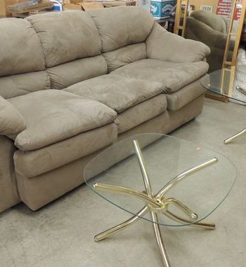Nice Tan Micro Fiber Sofa, Glass End Table, and Coffee Table Set